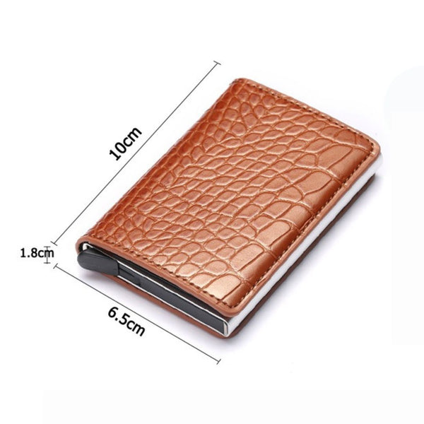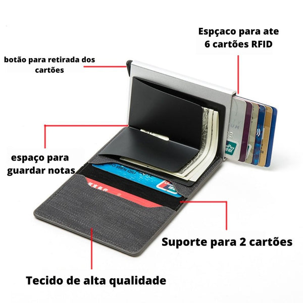 - Material: Couro sintético premium com tecnologia de bloqueio RFID.