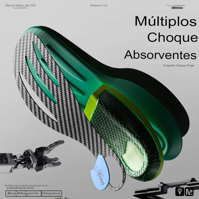 A tecnologia de fibra de carbono armazena parte da energia do impacto e a libera na fase de impulso, garantindo velocidade aprimorada, mais explosão e aterrissagens suaves. Disponível nas versões Red 0.4mm e Green 0.6mm, oferece suporte anatômico e desempenho superior para atletas exigentes.